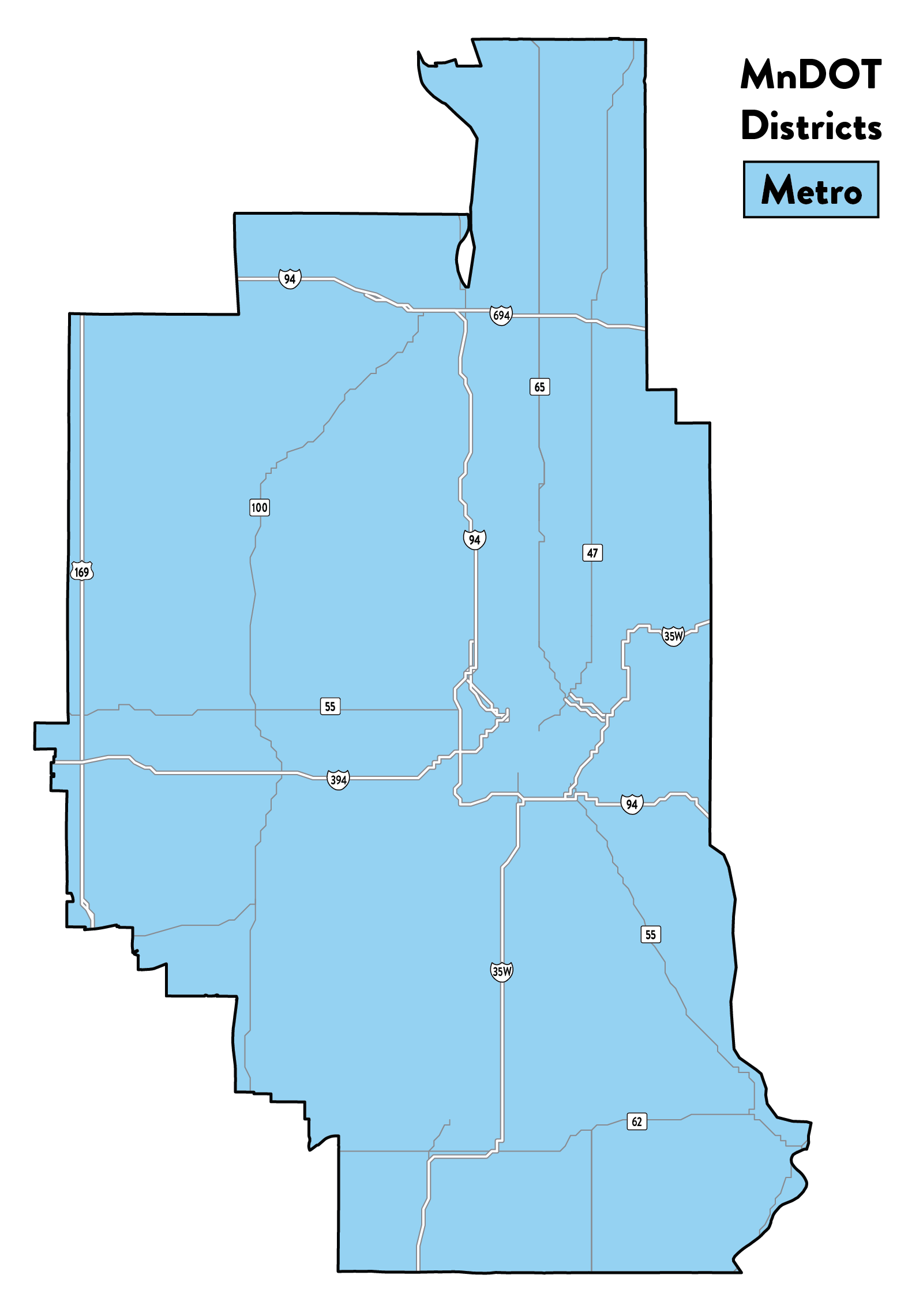Congressional District 5 includes the entire City of Minneapolis, as well as portions of Anoka and Ramsey counties. It is located entirely within MnDOT Metro District. Interstate highways I-94, I-694, I-394, and I-35W pass through the district.