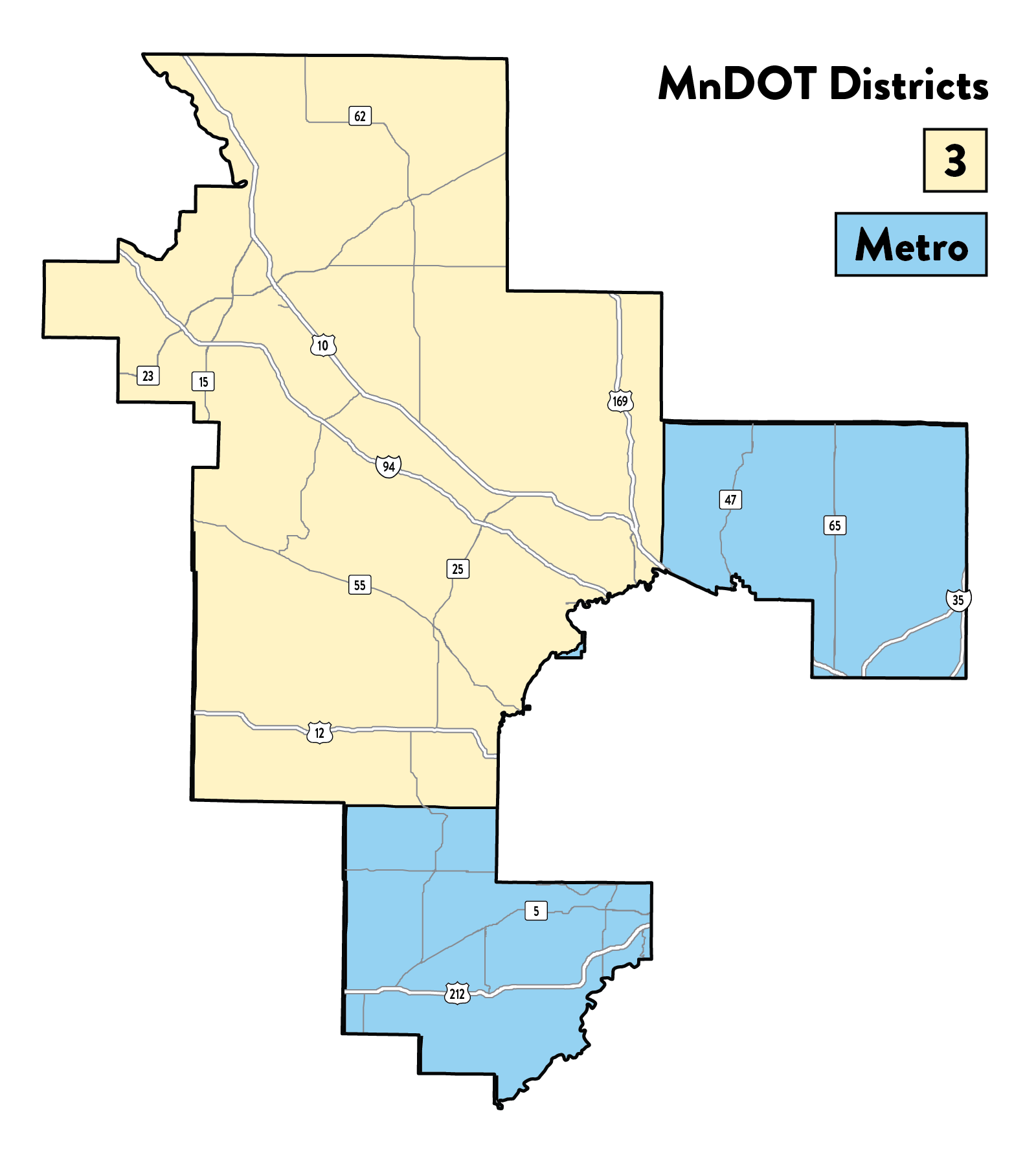 Congressional District 6 is located in the central portion of the state and overlaps with parts of MnDOT District 3 and MnDOT Metro District. Interstate highway I-94 connects St. Cloud to the Twin Cities metro area. Other major corridors in the area include Highway 10 and Highway 169.
