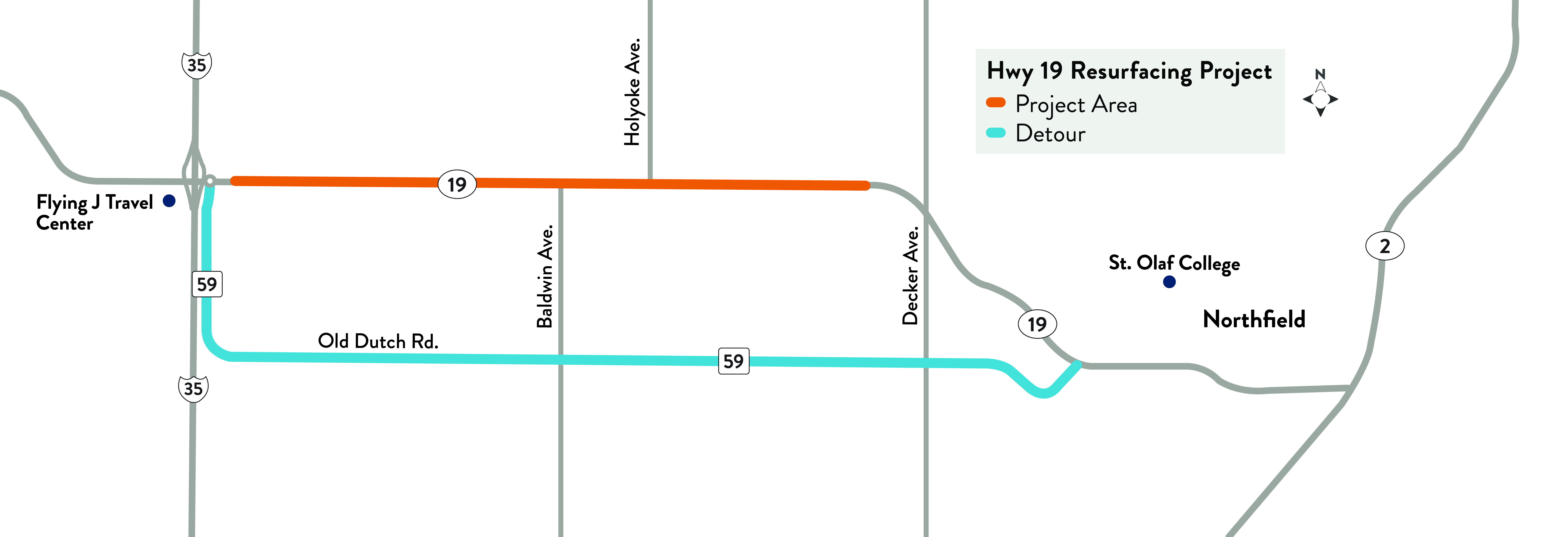 Resurfacing of Highway 19 west of Northfield is scheduled to begin July 13, 2026. It is expected to be completed late-August 2026. Work will occur from Decker Avenue to the roundabout east of I-35.