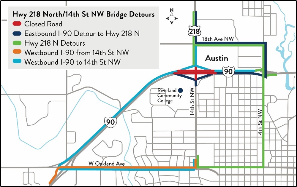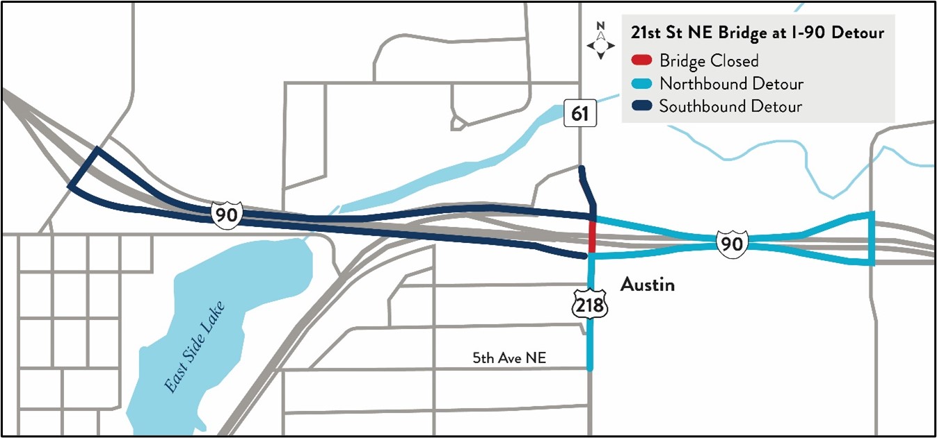 • Highway 218 south (21st Street NE) bridge near Austin Municipal Airport: Beginning at noon on Friday, April 17, the bridge will close and traffic will be detoured. At 7 p.m., bridge demo will begin and I-90 will be detoured through 6 a.m. on Monday, April 20.