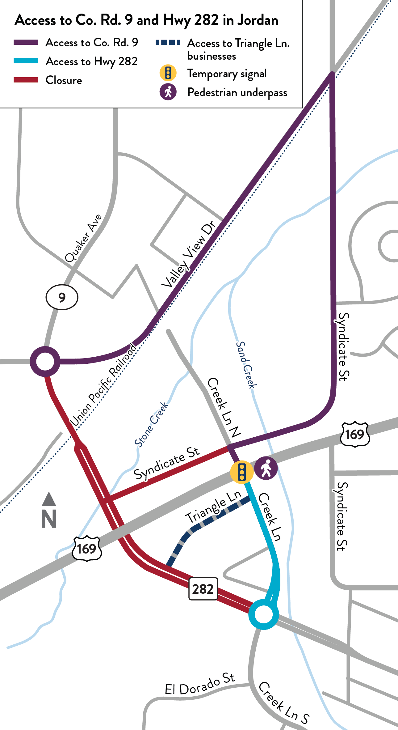 All traffic impacts are tentative and weather dependent. Syndicate St. to/from Hwy 169 is permanently closed. Triangle Ln. is permanently limited to right in/right out access to/from Hwy 282, use Hwy 282/Creek Ln. roundabout.