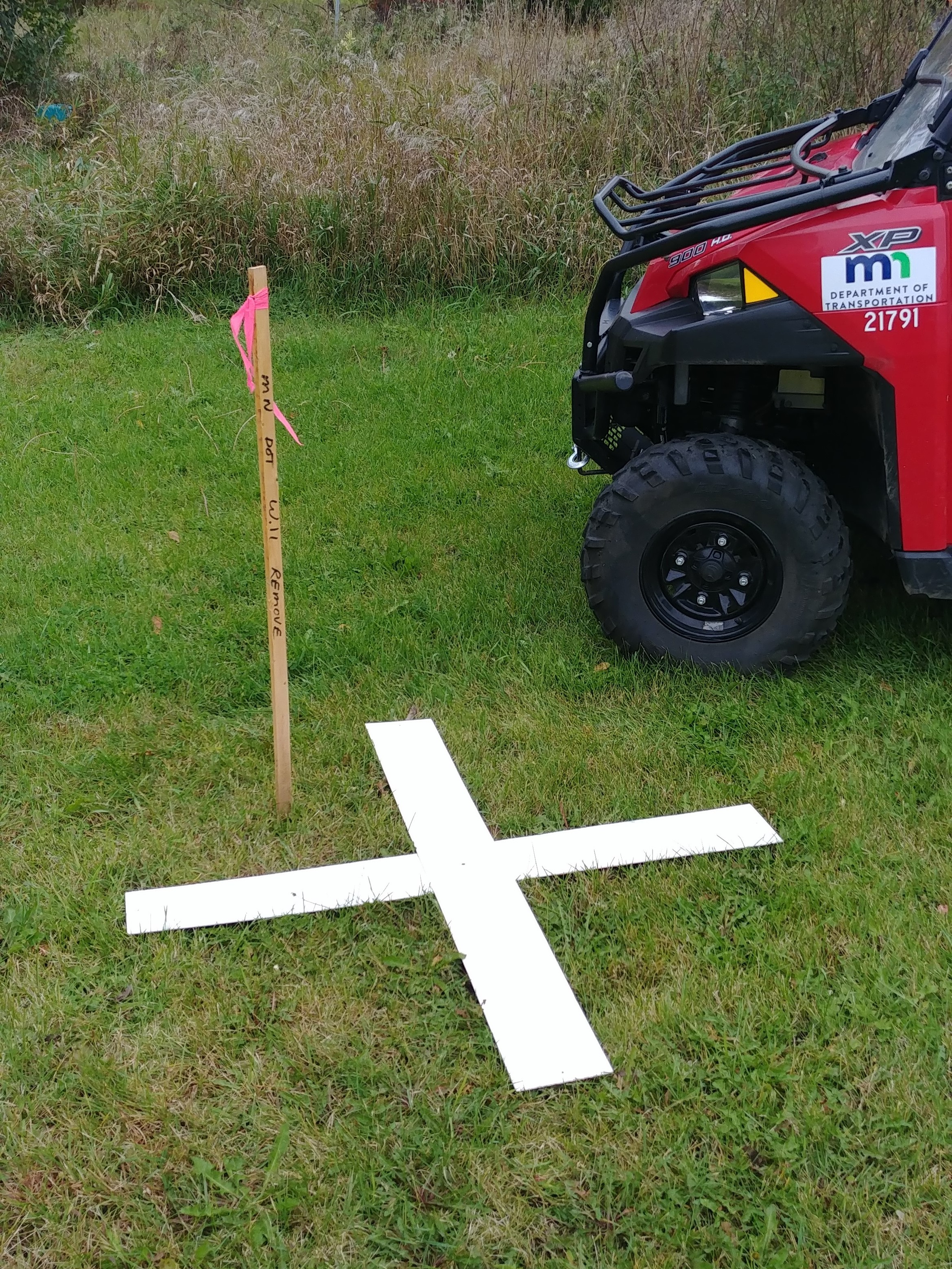 Aerial mapping is used to create a record of existing infrastructure and landscape along MnDOT right of way for transportation planning and highway design. In order to obtain accurate aerial mapping, MnDOT crews paint large white “X” targets on paved surfaces, and place plastic or fabric “X” targets on unpaved surfaces.