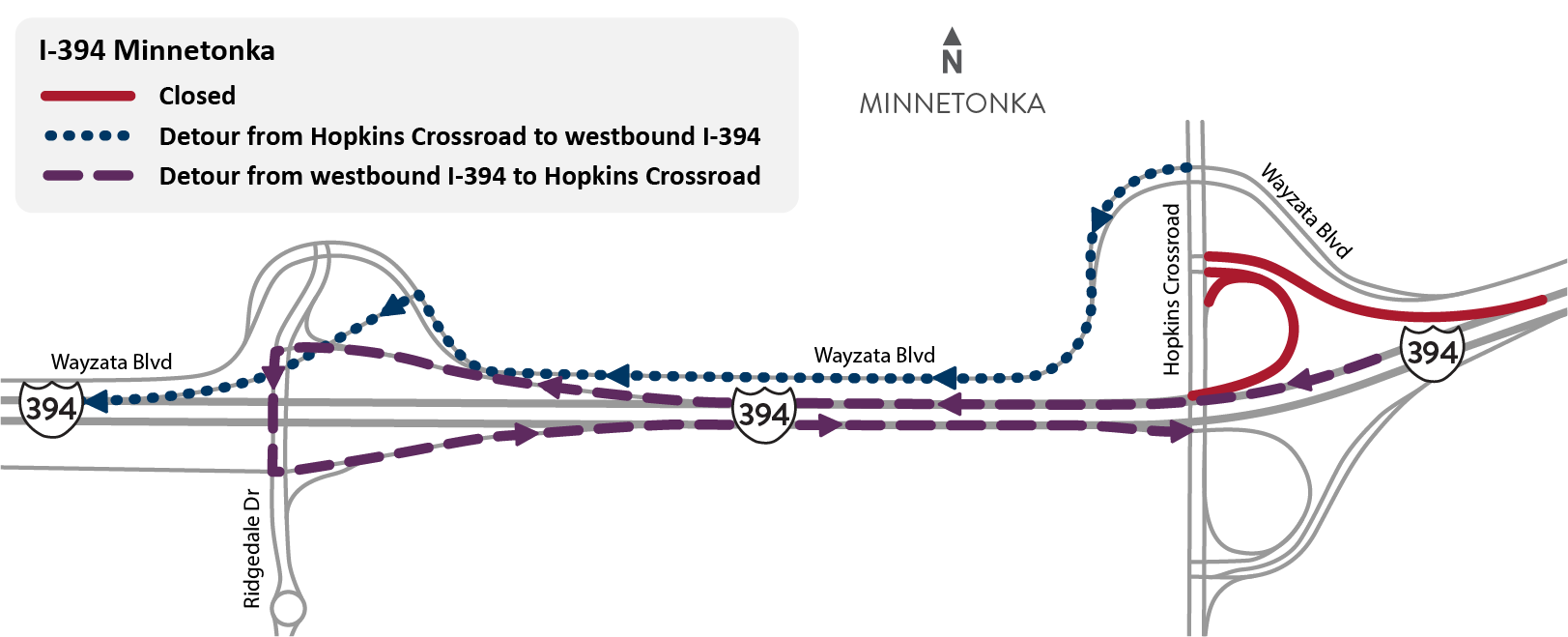- Detour: Ridgedale Drive exit to eastbound I-394 to Hopkins Crossroad.